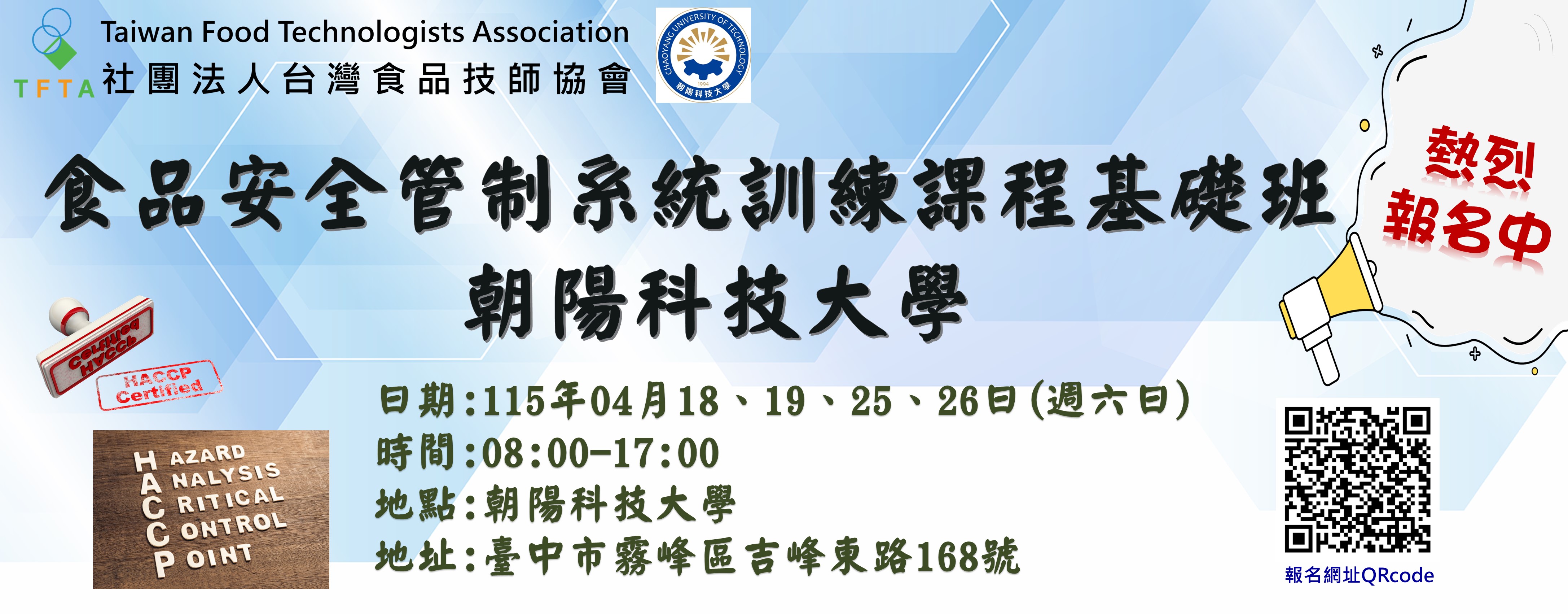 【活動報名】114/12/13-12/21食品安全管制系統訓練課程基礎班【中臺科技大學班】